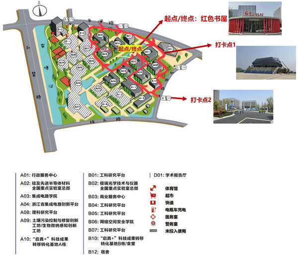 红色书屋(起点)→D01(打卡点1)→3号门(打卡点2)→红色书屋(终点)。